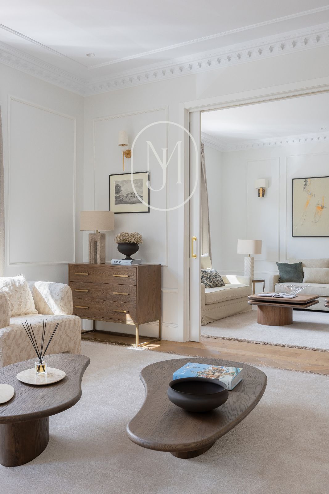 El espacio social ha sido concebido para la representación y el confort absoluto, distribuyéndose en tres amplios ambientes de salón que se entrelazan con un comedor formal y una cocina de diseño semi-integrada, equipada con los más altos estándares. Cada rincón de esta reforma a estrenar respira sofisticación, entregándose totalmente amueblada con piezas que dialogan a la perfección con la arquitectura clásica del edificio.